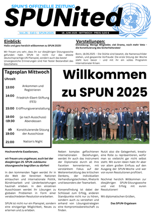 Durch die Zusammenfassungen aus den Ausschüssen erhält jeder Delegierte einen Überblick über die Arbeit in den anderen Gremien. Erfahrungsberichte der Abendveranstaltungen gehören ebenso zum Themeninhalt wie sonstige kreative Einfälle der Redaktion. Zudem geben zahlreiche offizielle Teilnehmer, die sich als Gastautoren versuchen, der SPUNited eine ganz individuelle Note.